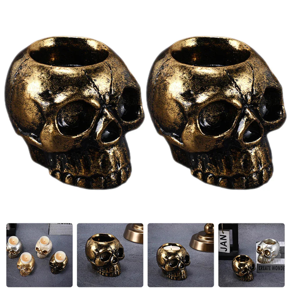 2 Pcs Skull Holder Tea Lights Decor – Halloween Resin Candlesticks for Unique Home Styling
