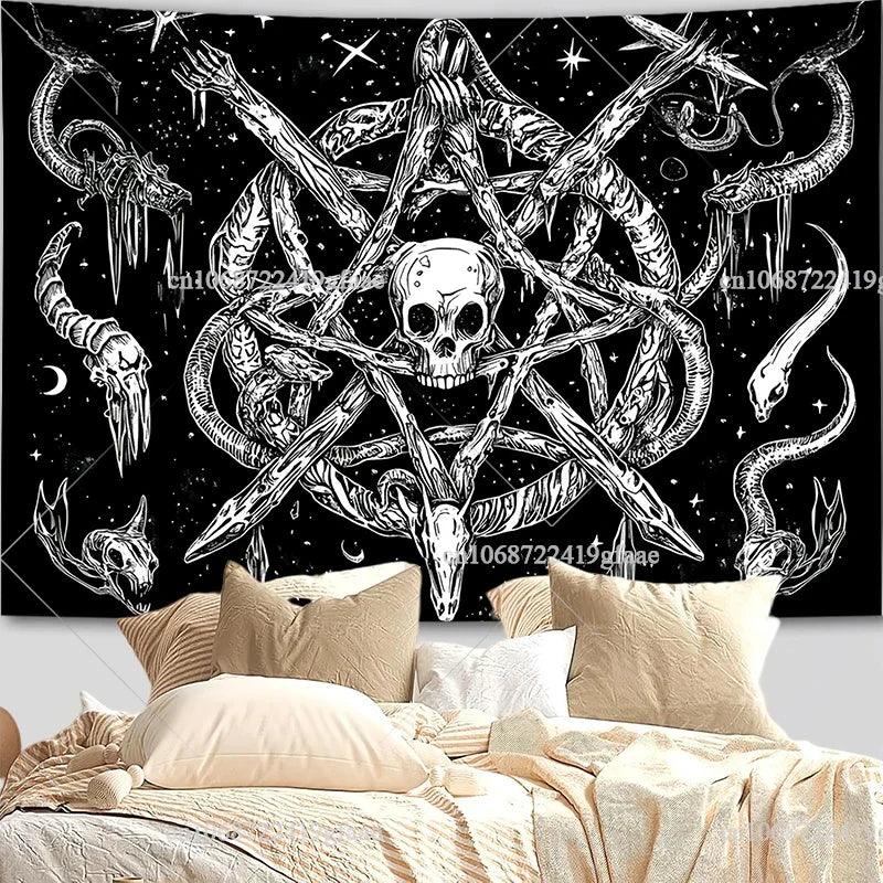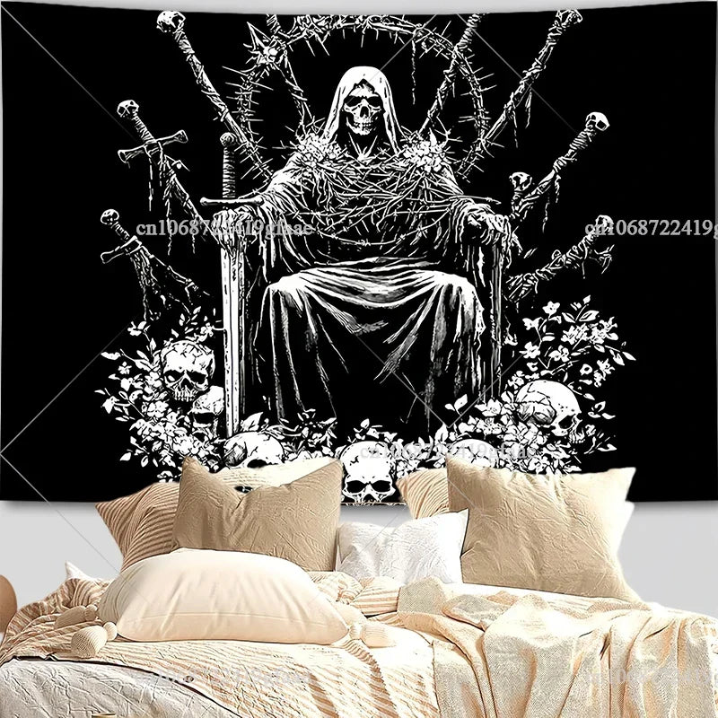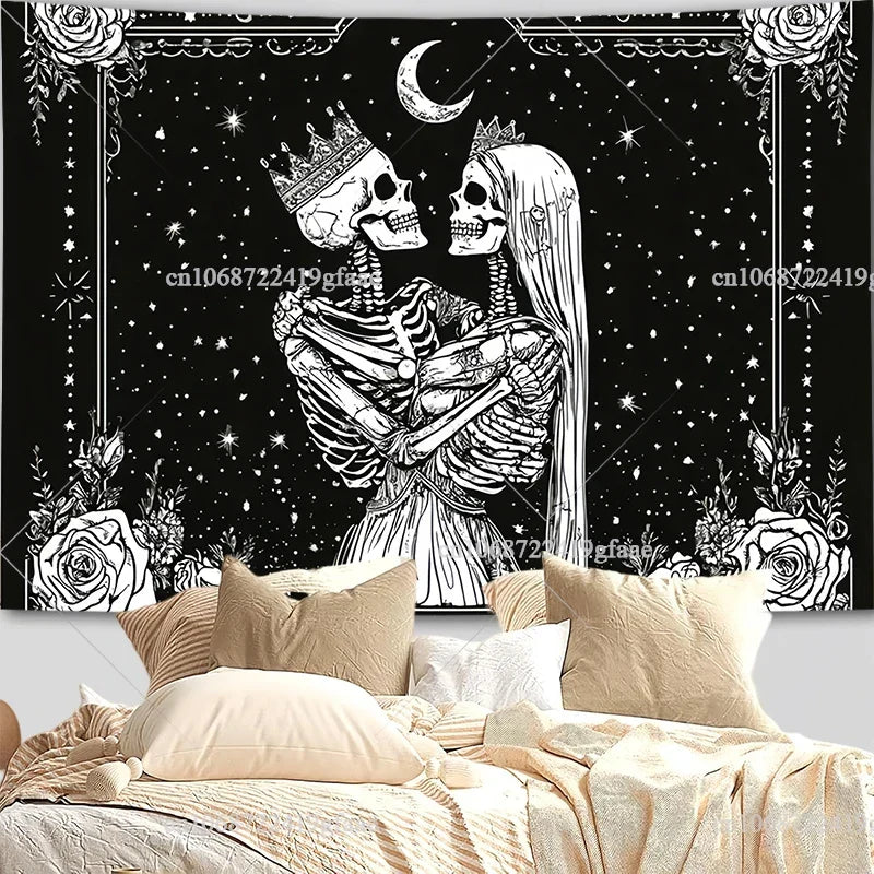 Elevate your space with dark elegance using this Gothic Skull Tapestry — featuring a bold black and white skeleton design perfect for room decor, Halloween aesthetics, or as a dramatic party backdrop.