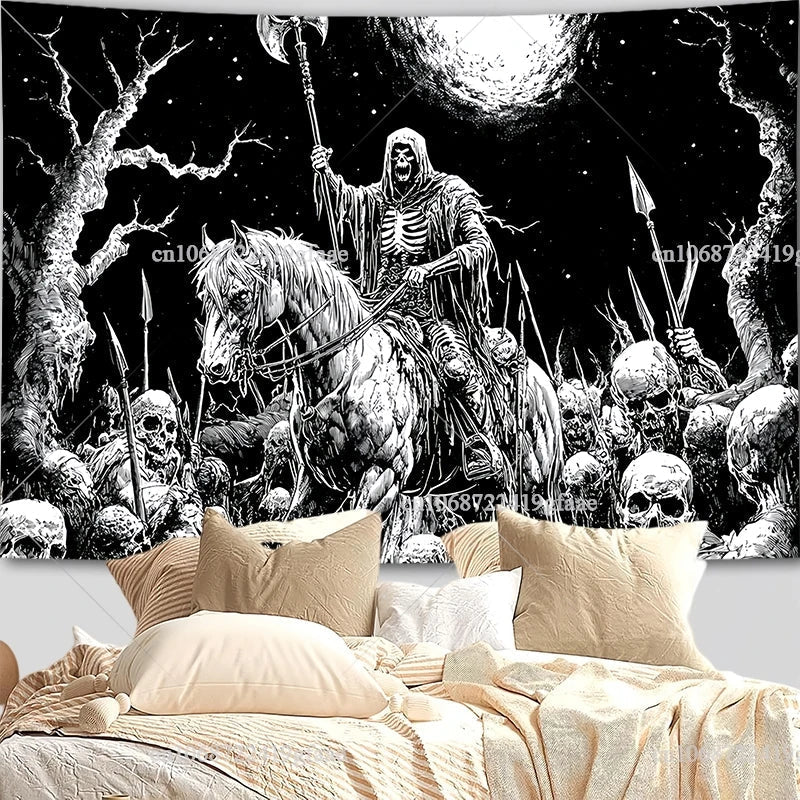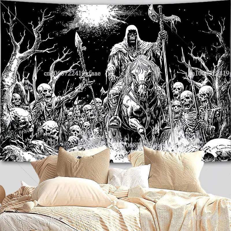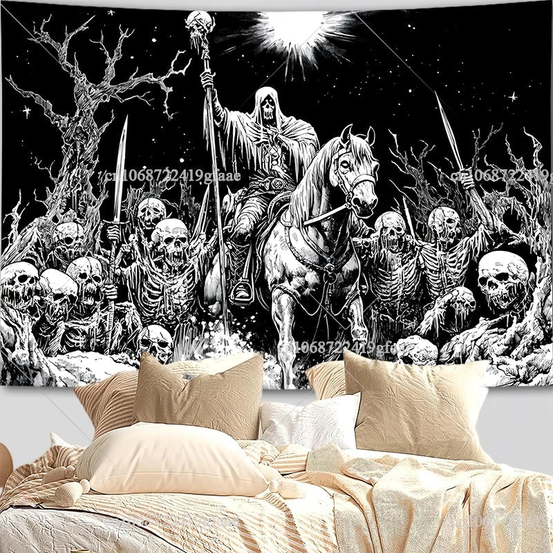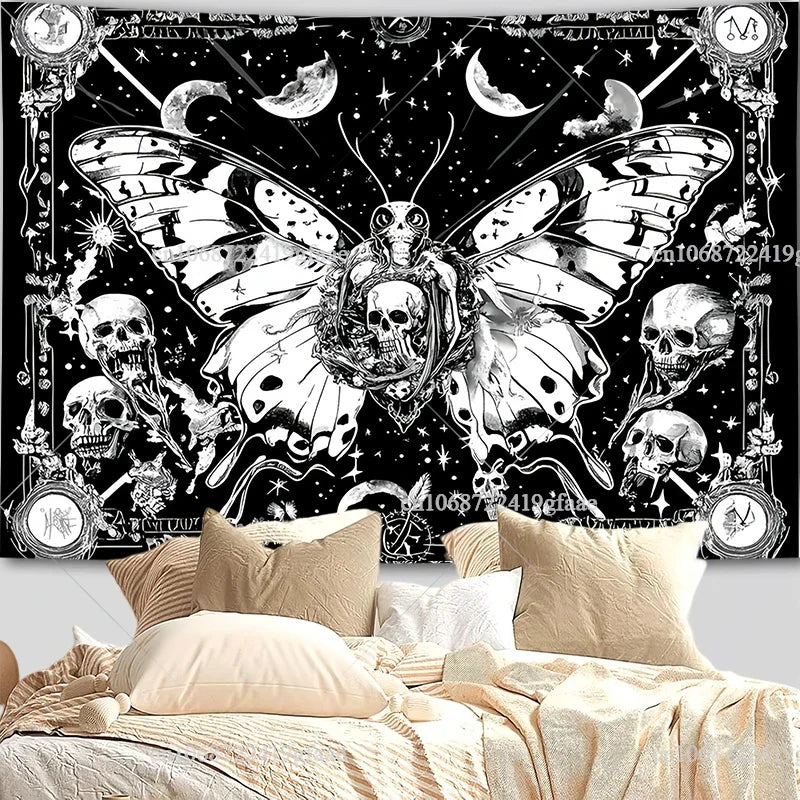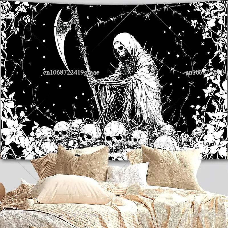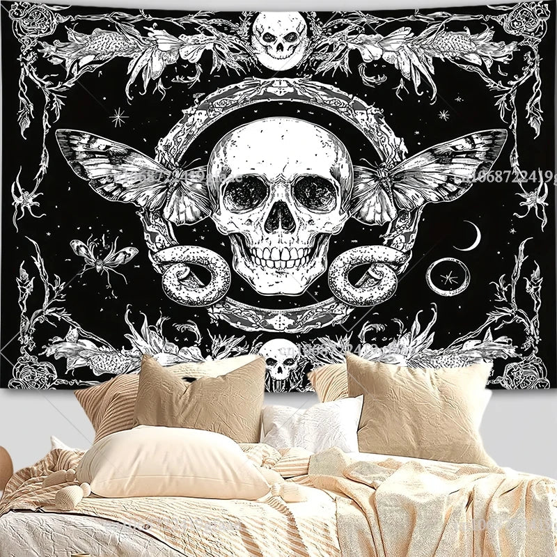 Gothic Skull Tapestry – Black & White Skeleton Wall Hanging for Halloween & Room Decor